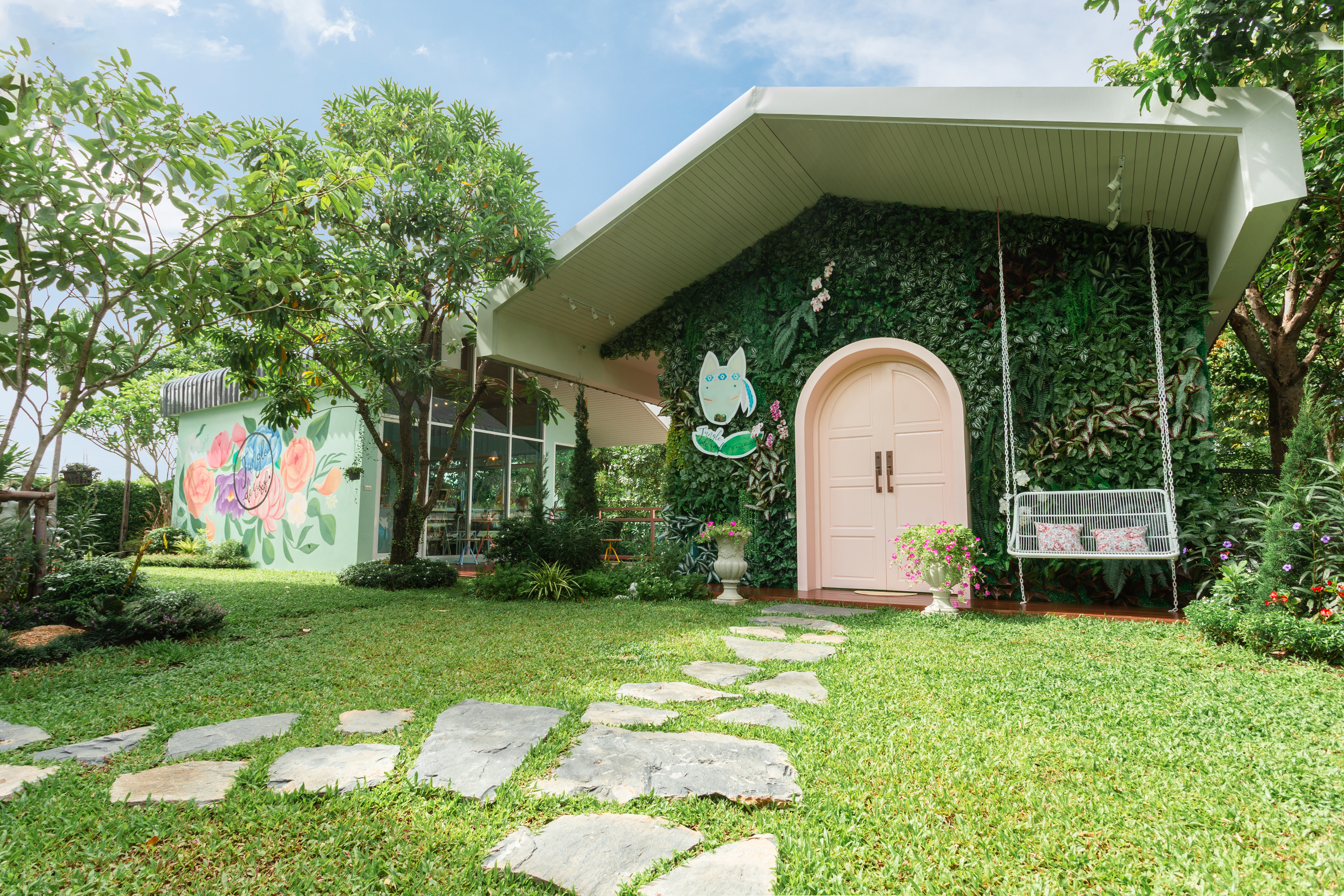 โซนคาเฟ่ สนามหญ้าจริง สีเขียวร่มรื่น มีต้นไม้ใหญ่ และโซนน้ำพุให้ทั้งเจ้าของและน้องหมาสามารถพักผ่อน และทำกิจกรรมร่วมกันได้