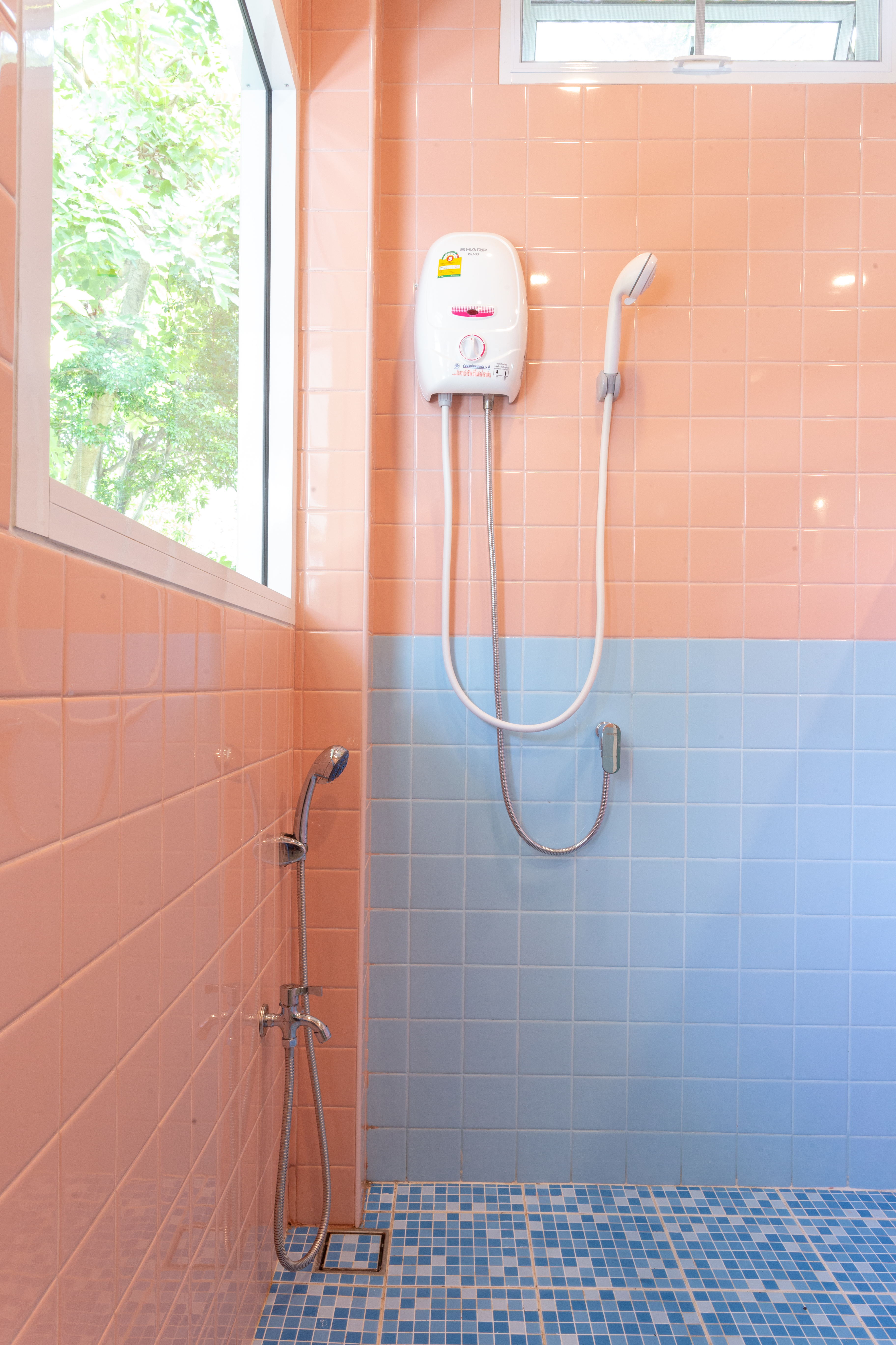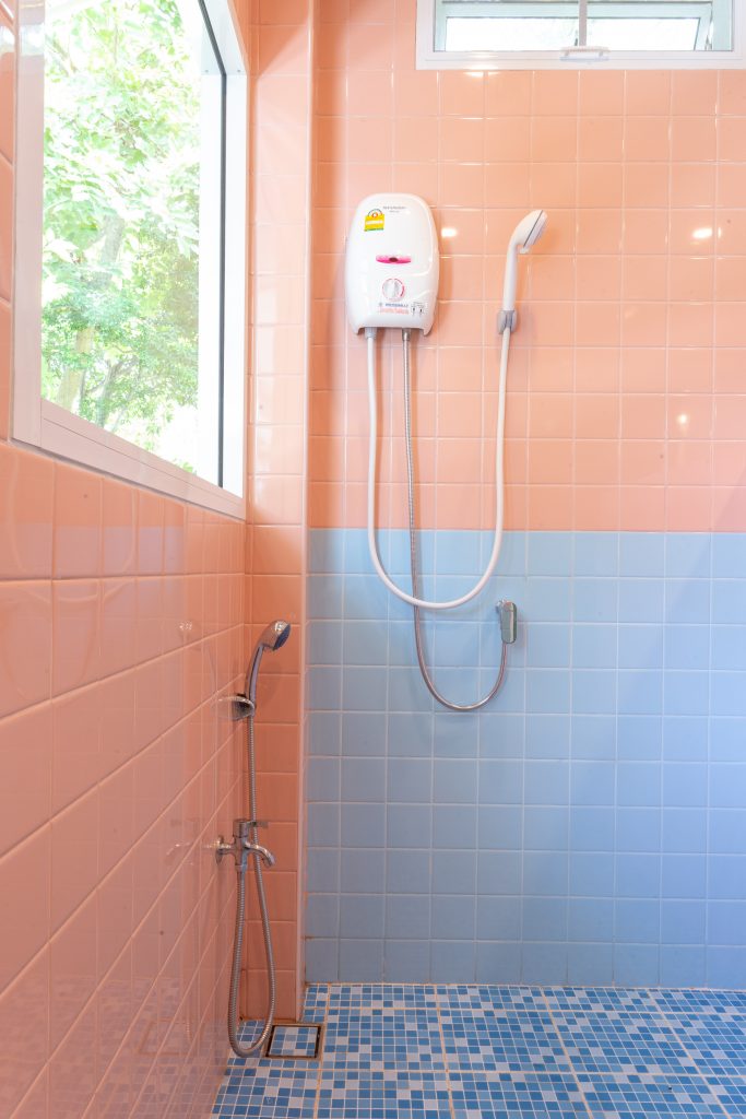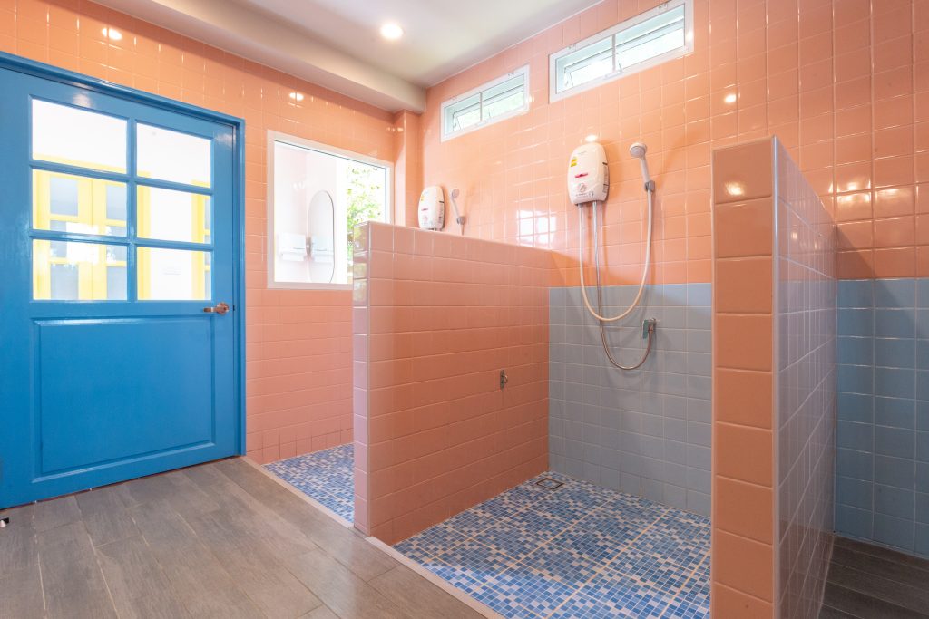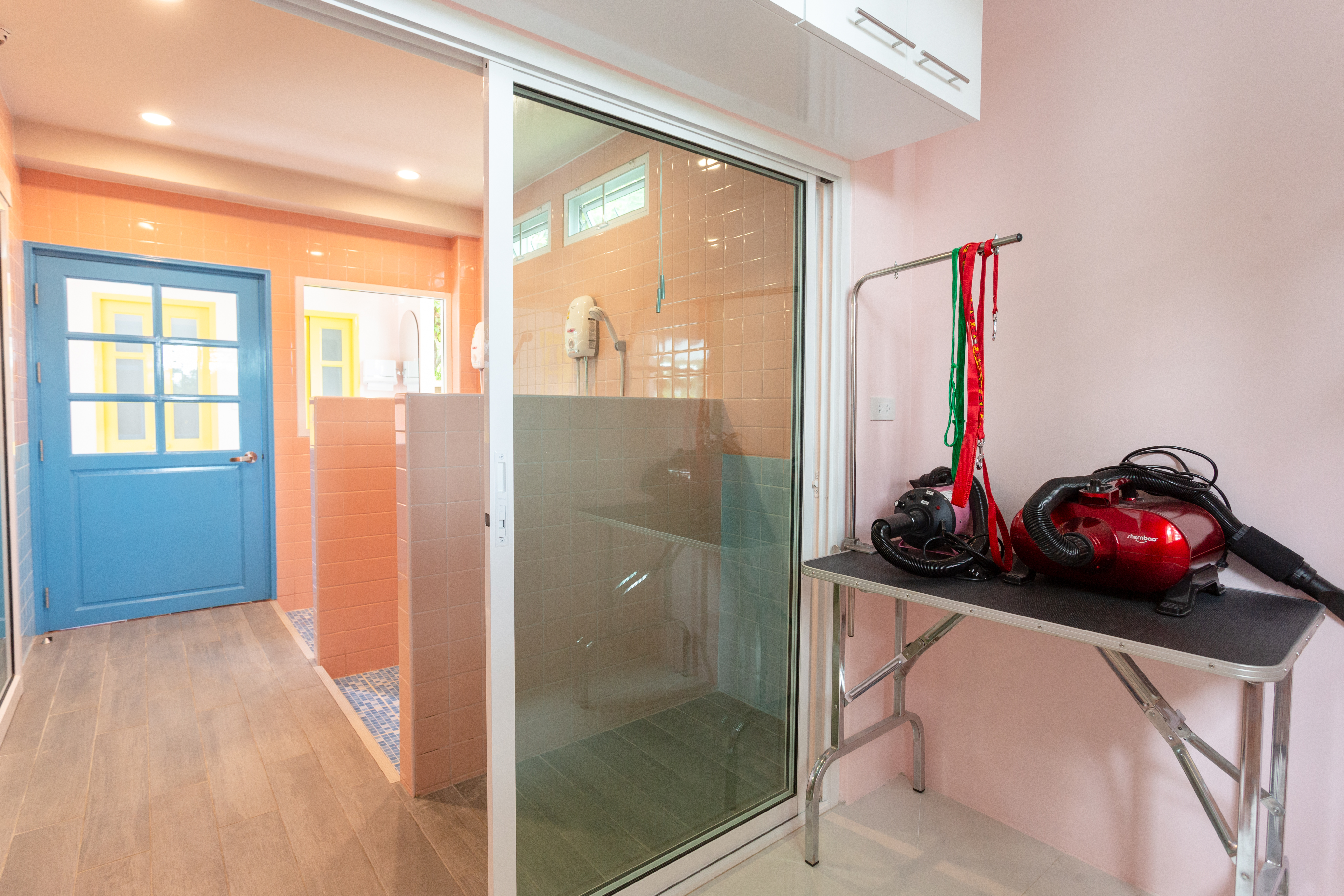 ส่วนอาบน้ำ เป่าขน ออกแบบให้เหมือนอยู่ในสระว่ายน้ำ คุมโทนสีด้วยชมพู ฟ้าของกระเบื้อง พื้นปูด้วยกระเบื้องกันลื่น มีเครื่องทำน้ำอุ่นทั้งสองห้อง รวมไปถึงแบ่งโซนสำหรับเป่าขนน้องหมา มีระบบระบายน้ำและระบายอากาศอย่างถูกสุขลักษณะ